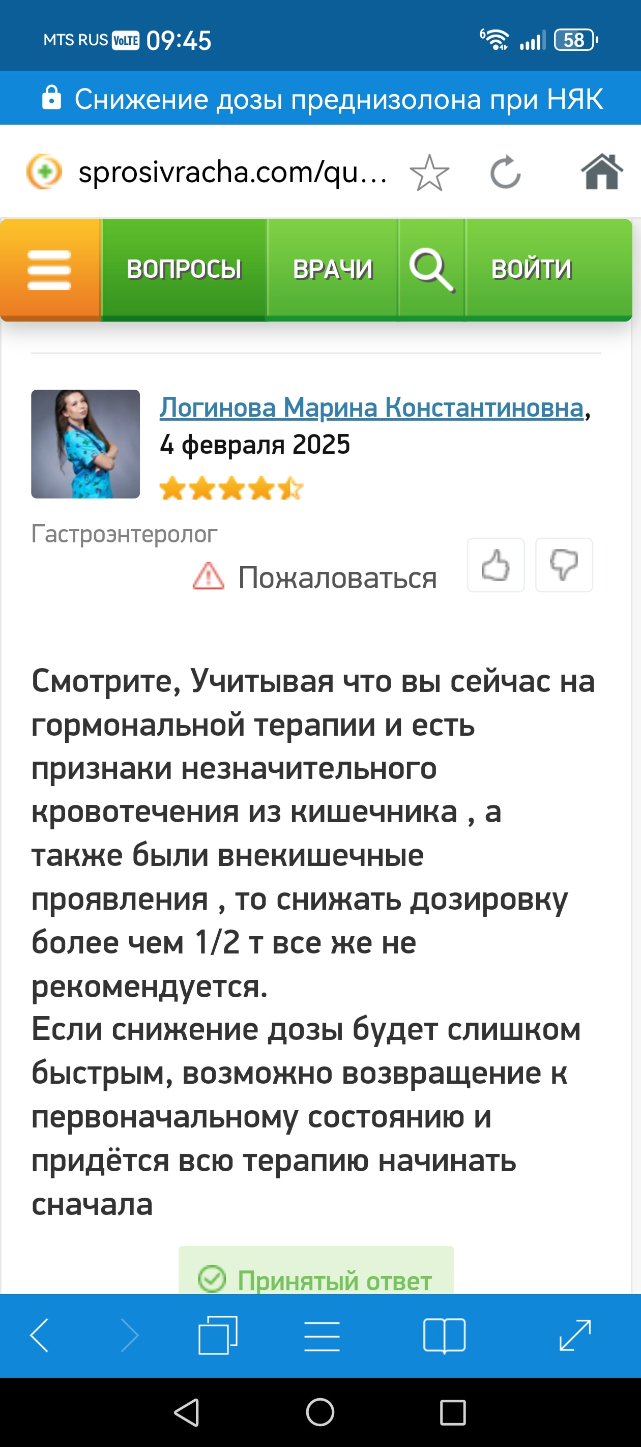 Вечная проблема отечественной медицины - протокол, многие из которых написаны в середине прошлого века, а то и раньше. Обычно упоротые в этом вопросе врачи среднего и старшего возраста, а молодые врачи в большинстве в этом отношении более гибкие. Не согласен с Дмитрием, для каждого протокола есть свои исключения. Во всем нужен индивидуальный подход. Да, приём гормонов, особенно длительный, может быть чреват различными неприятными последствиями, но опять таки, опыт применения гормонов пациентами, которым они назначенны пожизненно, показывает, что при соблюдении всех правил приёма (приём строго после еды, вместе с ИПП и т. д), риски сводятся к минимуму. К тому же надо особое внимание надо уделять опасности последствий отмены гормонов для больного и выбирать наиболее безопасный для конкретного случая способ отмены. Тем более, что быстрое снижение иногда приводит к более опасным последствиям, чем медленное, но более длительное. К тому же, сейчас уже даже многие врачи уходят от устаревшего протокола по отмене гормонов и сами рекомендуют убирать от 1/4 до 1/2 таблетки. Разнятся только время убирания частей таблетки, от 3-х недель до 5-7 дней четвертинку или половинку таблетки. Я не врач, основываюсь только на личном опыте и опыте моих многих знакомых, а так же из форума по отмене на кронпортале.