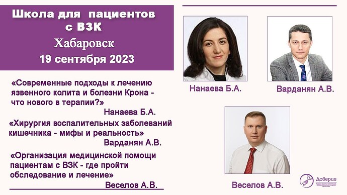 В рамках Школы выступят ведущие специалисты в области лечения ВЗК. Вы узнаете о маршрутизации пациентов в Хабаровском крае, наиболее современной терапии ВЗК, рисках длительного приема тех или иных препаратов, особенностях питания, психологических и медицинских аспектах хирургического лечения. У вас будет возможность задать интересующие вопросы спикерам.